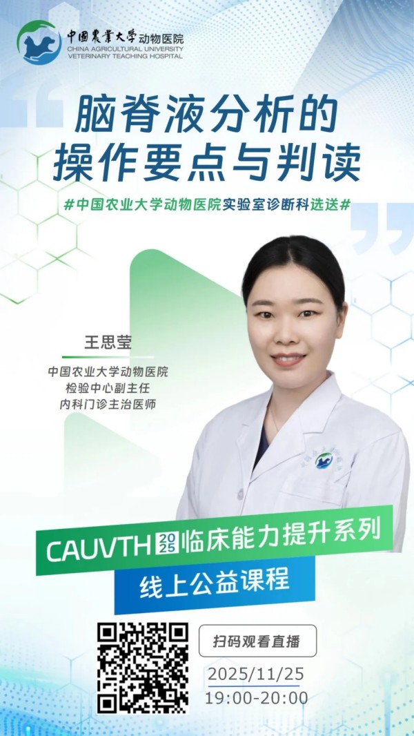 今晚19:00《CAUVTH2025临床能力提升系列线上公益课程 | 神经科医生的第二双眼睛——脑脊液分析的操作要点与判读》 将由中国农业大学动物医院实验室诊断专科王思莹医生与大家分享!