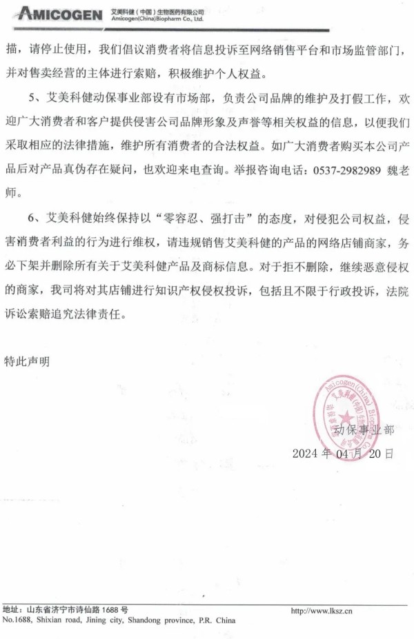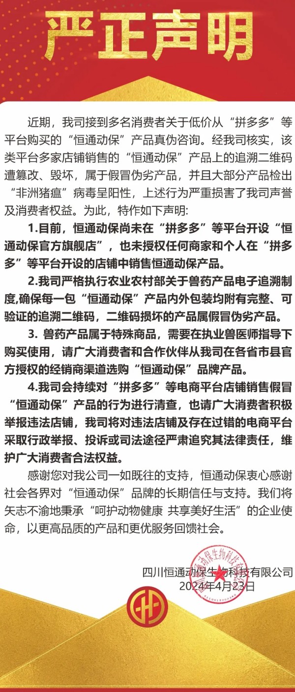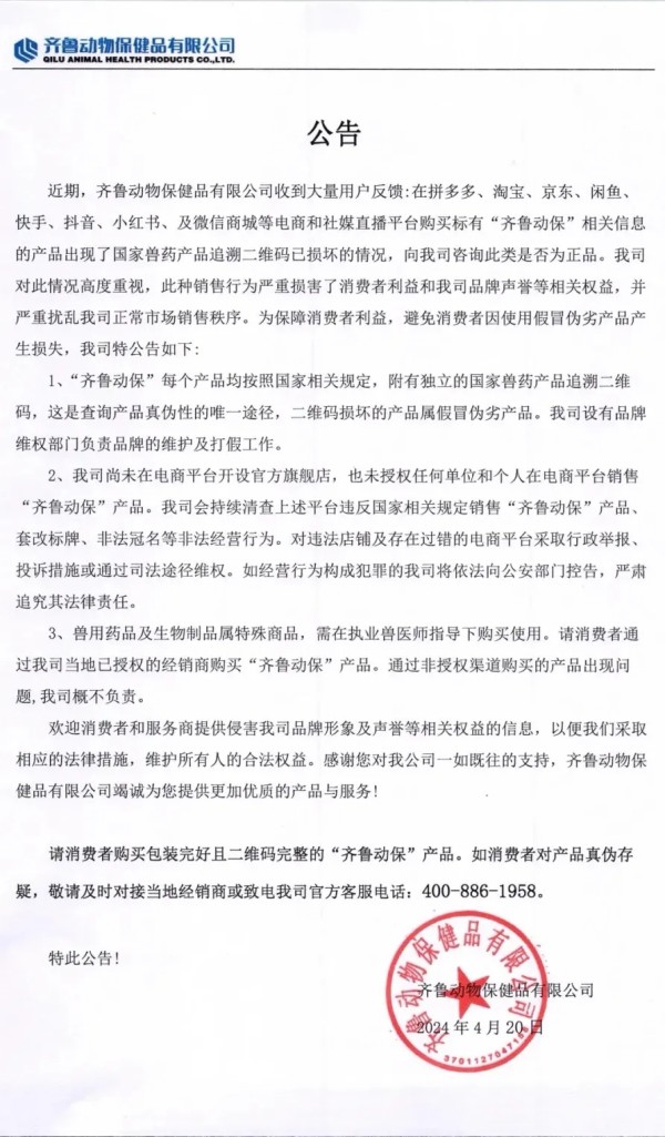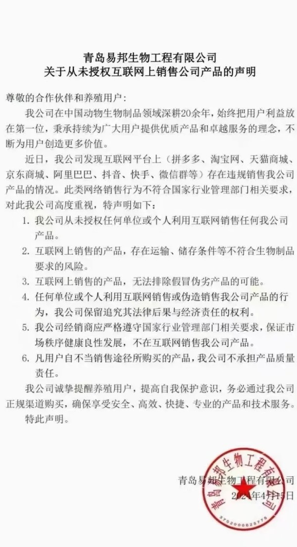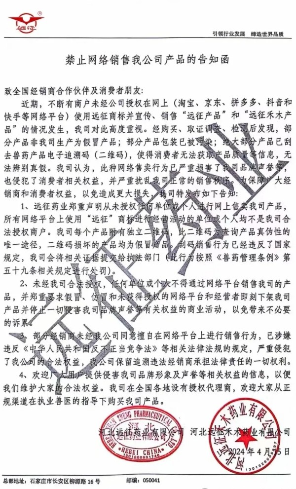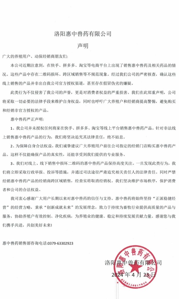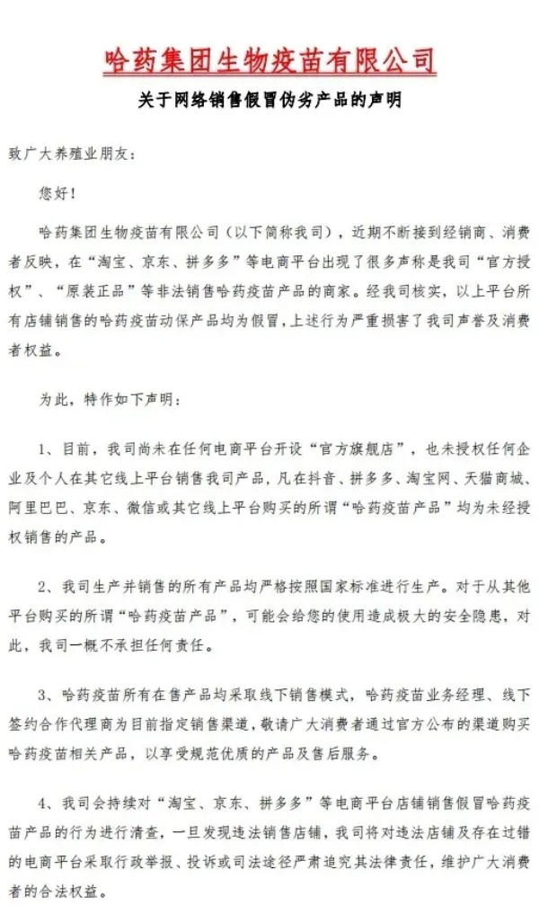 随着这几年我国互联网兽药销售的假冒伪劣的泛滥,国内大型兽药企业,都先后开启了网上打击冒充自己企业的假冒伪劣兽药产品,先后有山东齐鲁动保、哈药集团疫苗、山东青岛易邦、河南牧翔生物股份、河北远征、重庆方通、山东信得科技、山东艾美科健、湖北回盛生物、洛阳惠中生物、四川恒通动保和天津中升挑战等大型兽药企业公开打假与维权。