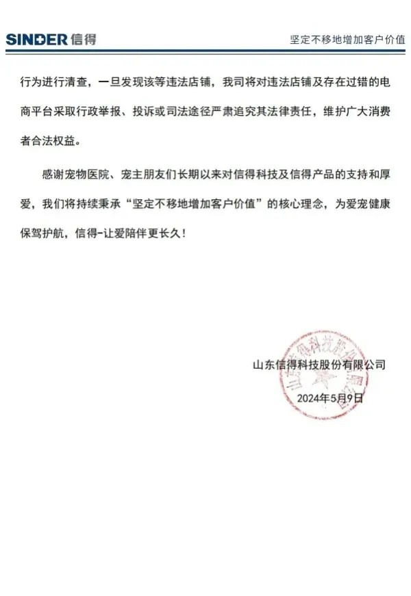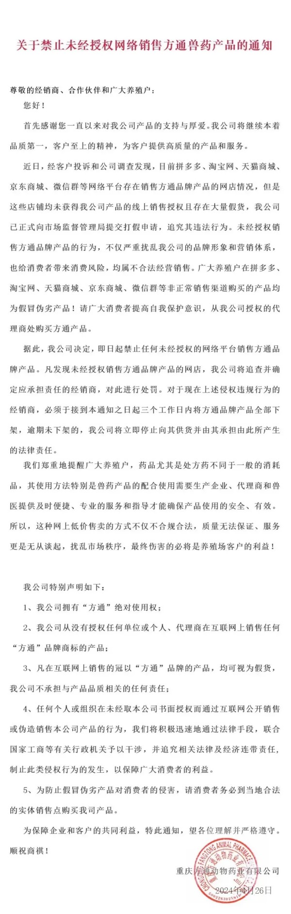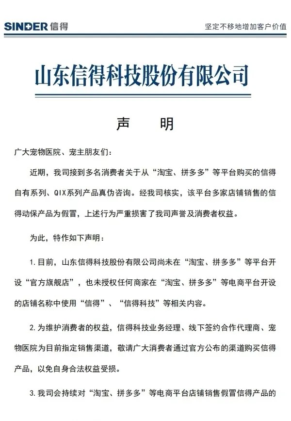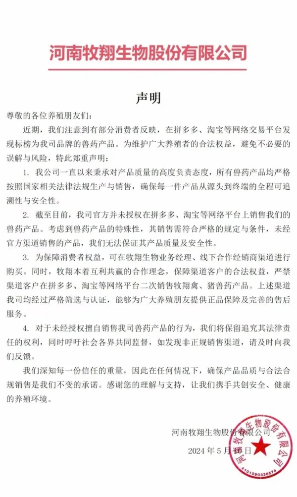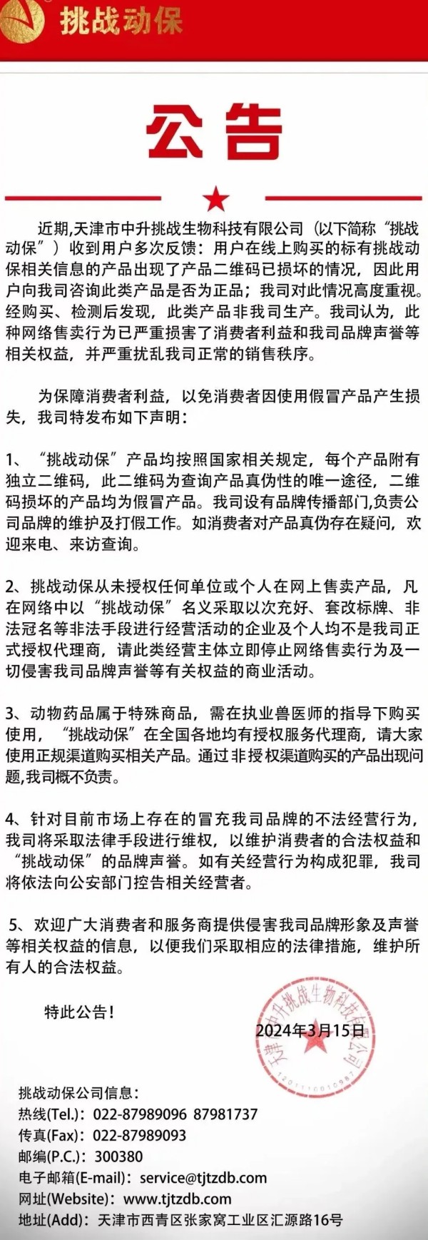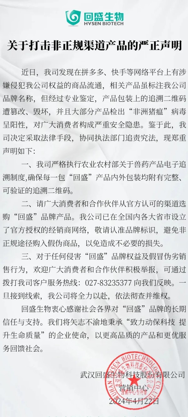 随着这几年我国互联网兽药销售的假冒伪劣的泛滥,国内大型兽药企业,都先后开启了网上打击冒充自己企业的假冒伪劣兽药产品,先后有山东齐鲁动保、哈药集团疫苗、山东青岛易邦、河南牧翔生物股份、河北远征、重庆方通、山东信得科技、山东艾美科健、湖北回盛生物、洛阳惠中生物、四川恒通动保和天津中升挑战等大型兽药企业公开打假与维权。