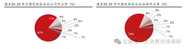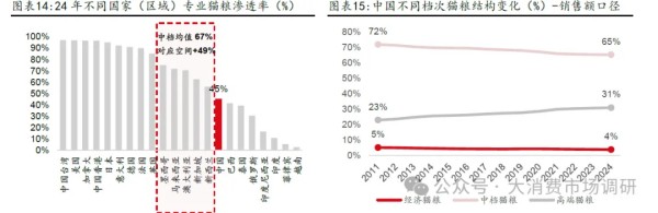 2011-2024 年,专业猫/狗粮渗透率分别提升29/20pcts。从渗透率提升速率上看,提升速率有所加速,12-21 年(合计10 年)专业猫粮/狗粮渗透率分别平均每年提升1pcts/1pcts,22-24 年(合计3 年)专业猫粮/狗粮渗透率分别平均每年提升5pcts/3pcts。2024 年中国专业宠物猫/狗粮渗透率分别为45%/25%。横向对比看,当前中国专业宠物粮渗透率与其他成熟市场仍有较大差距,处于全球主要国家(区域)专业狗/猫粮渗透率中下游区间,分别相较专业狗粮/猫粮渗透率中档均值还有67%/49%的空间。