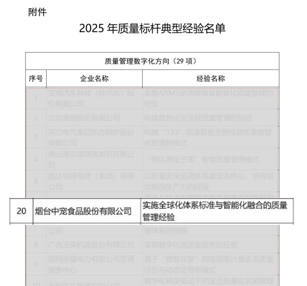 中宠股份获国家级质量标杆荣誉 近日,中国质量协会公布“2025年质量标杆典型经验”名单,中宠股份凭借实施"全球化体系标准与智能化融合的质量管理经验"成功入选,是中国宠物行业第一家以及唯一一家获得国家级质量标杆称号的企业。据悉,“全国质量标杆”评选活动是由工业和信息化部主导、中国质量协会组织评选的国家级荣誉,旨在强化提升企业质量管理水平,推动培育和建设产品卓越、品牌卓越、创新领先、治理现代、具有核心竞争力的一流企业,助力中国制造业高质量发展。
