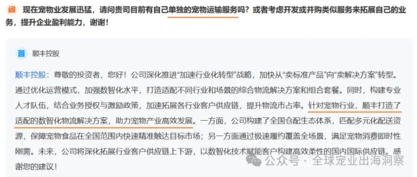 全球宠业出海洞察消息,顺丰控股近日在投资者互动平台上回答投资者提问时透露,针对宠物行业,顺丰已打造适配的数智化物流解决方案,助力宠物产业高效发展。一方面,公司构建了全国仓配生态体系,匹配多元化配送资源,保障宠物食品在全国范围内快速精准触达目标市场;另一方面,通过极速履约覆盖全场景,满足宠物消费即时性刚需。