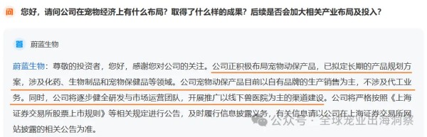 近日,上市动保企业青岛蔚蓝生物股份有限公司(以下简称:蔚蓝生物)在投资者平台对有关公司“在宠物经济方面的布局、现有成果及后续是否加大产业投入”作出了回应。