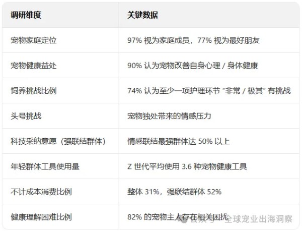 情感联结上,97%主人视宠物为家人,77%称其为挚友,90%认为宠物改善了自身身心健康。但74%主人面临饲养难题,核心挑战前两位为宠物独处的情感压力、兽医护理费用,后者对低收入(35%年收入低于6万美元家庭关注)及多宠家庭(34%关注)影响更大。