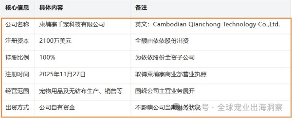 依依股份发布公告称,基于对国际形势与市场趋势的深度研判,为推进全球化战略布局,以自有资金 2100 万美元在柬埔寨投资设立全资子公司 “柬埔寨千宠科技有限公司”,围绕公司主营业务展开。