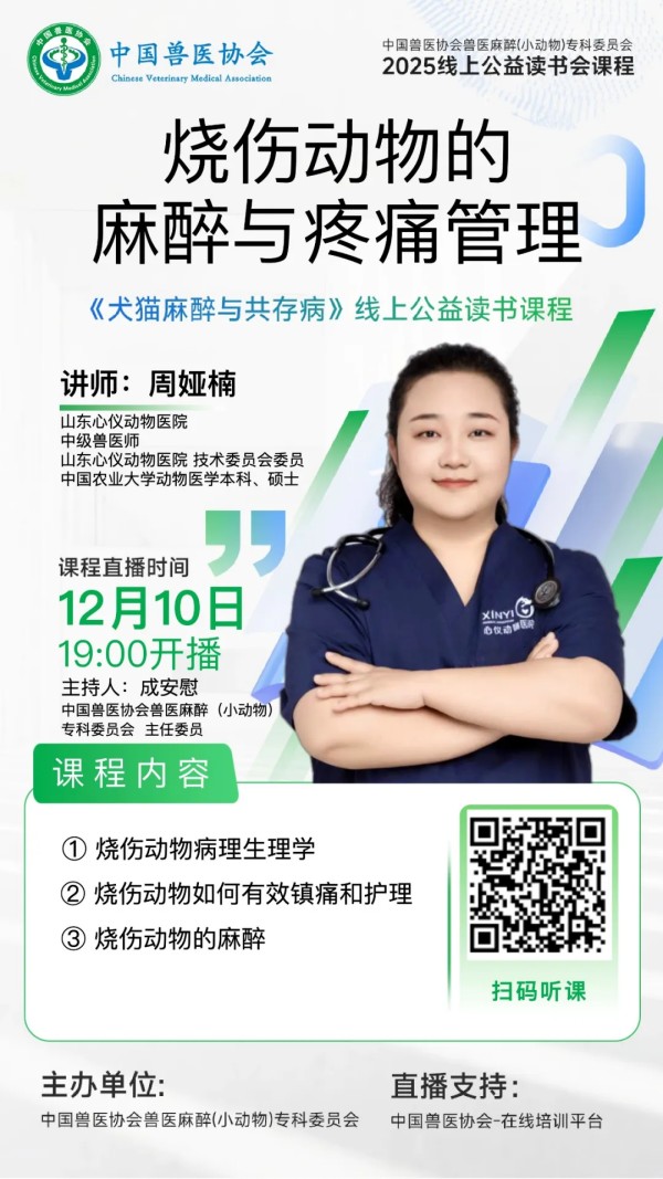 线上公益读书会创伤动物是时常需要麻醉医生参与管理的病例类型之一,其中,也包括家庭起火等导致的烧烫伤,而严重烧伤则常见于灾难性事件中。对此类病患,预防烧伤导致的休克、感染、疼痛是动物恢复的关键管理点。本节分享有助于广大医生了解烧伤的发展过程和应对方案,为动物减轻疼痛,提高生存几率。欢迎各位同行积极参与探讨!