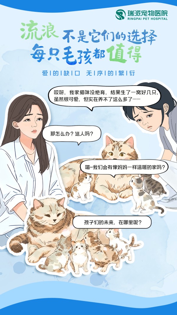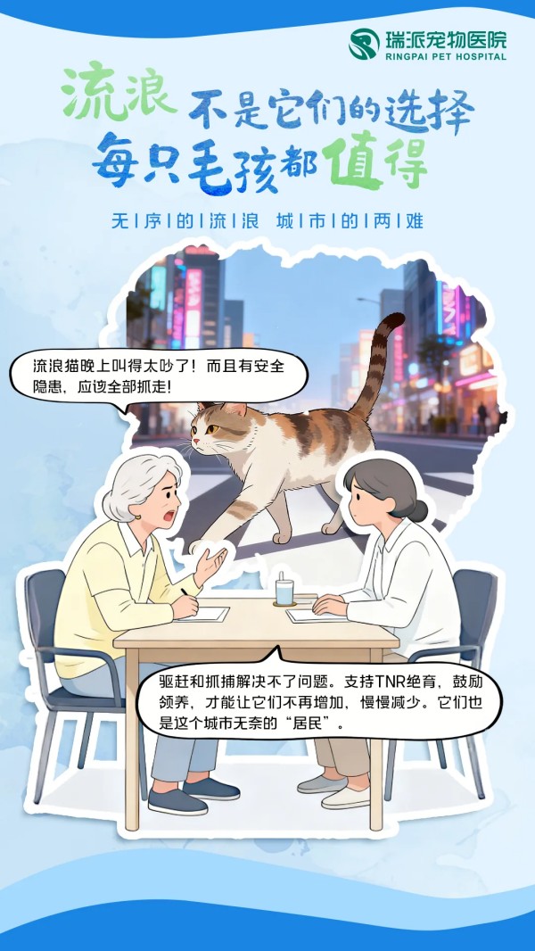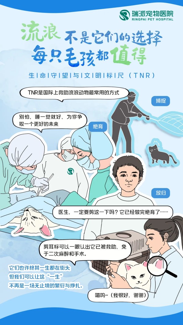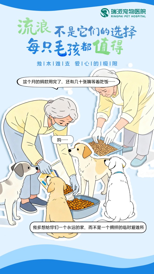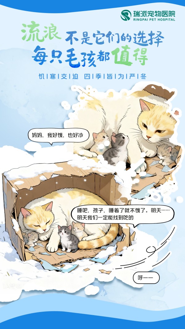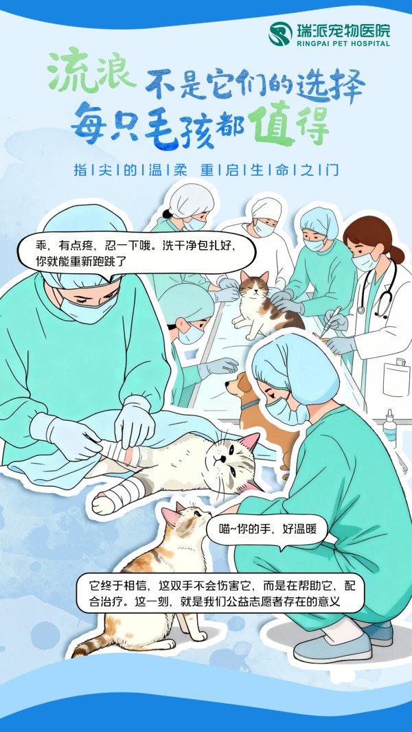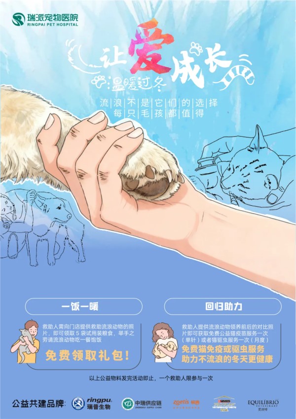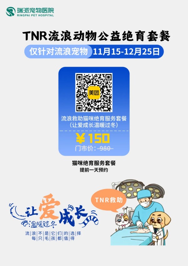 (公益活动) 流浪不是它们的选择 每只毛孩都值得 2025瑞派公益活动正式营业 它们未曾选择流浪 却被迫在寒风中瑟瑟发抖 被遗弃、被忽视 甚至被偏见定义为“城市的负担” 但流浪从不是它们的身份 只是一段艰难的处境 流浪不是它们的选择 RINGPAI 公益 每只毛孩 都值得 每只毛孩 都值得被看见、被珍爱 它们胆怯的眼神 脏污的毛发下 藏着独一无二的灵魂 渴望一个回应它们 “值得”的拥抱 这一次,让我们成为它们无声生命的辩护人。你的理解与选择,能打破它们命运的枷锁,让一个“无名之辈”成为家中的宝贝,为它们兑现那份本应拥有的温暖与承诺。 每只毛孩都值得 11月15日-12月25日,瑞派将正式开启2025年度公益活动。组建医疗服务团队联合品牌方「探访公益基地」进行物资捐赠和驱虫免疫等公益医疗服务;上线「公益绝育活动」为流浪动物开启专属绝育服务;在天津瑞派津康宠物医院(香槟城店)、瑞派津康宠物医院(梅江店)发放「公益暖冬礼包」,帮助更多流浪动物摆脱饥寒交迫的生活,带来度过这个冬天的希望。 1 每年公益季,瑞派宠物都会联合品牌方共同发起系列公益活动,配置优秀宠物医疗团队,共同走进流浪救助基地,为基地的小动物们提供医疗服务支持,捐赠医疗用品、食品等物资。 2 小流浪专享公益猫咪绝育活动 11月15日-12月25日,瑞派萌宠星球集结天津瑞派笑康宠物医院、瑞派长江宠物医院(谊城公寓店)、瑞派长江宠物医院(大港店)、瑞派长江宠物医院(天塔店)、瑞派长江宠物医院(东兴路店)、瑞派长江宠物医院(津塘路店)、瑞派长江宠物医院(迎水道店)、瑞派长江宠物医院(琼州道店)、瑞派长江宠物医院(华龙道店)、瑞派长江宠物医院(仕嘉花园店)、瑞派长江宠物医院(中北镇店)、瑞派津康宠物医院(河西店)、瑞派津康宠物医院(梅江店)、瑞派津康宠物医院(香槟城店)共同发起“小流浪专享公益猫咪绝育活动”,为流浪动物开启专属福利绝育通道,用科学有效的方式从源头守护,许它们一个免于无序繁殖困扰的未来。 扫描上方专属二维码,就近选择瑞派定点医院,为小流浪进行TNR救助关键一步——绝育手术。 3 定点领取“公益暖冬礼包” 公益活动期间,将在天津瑞派津康宠物医院(梅江店)、瑞派津康宠物医院(香槟城店)设置定点医院,发放宠物粮、疫苗、驱虫药品等物资,供社会爱宠人士救助流浪动物使用。 一饭一暖 救助人需向门店提供救助流浪动物的照片,即可领取5袋试用装粮食,举手之劳请流浪动物吃一餐饱饭。 回归助力 救助人提供流浪动物领养前后的对比照片,即可获取免费公益猫疫苗服务一次(单针)或者猫驱虫服务一次(月度)。 *以上公益物料发完活动即止,一位救助人限参与一次。 4 “毛孩暖冬日记” 欢迎评论区留言,上传你救助小流浪的日常照片或领养小流浪的前后对比图,传递冬日里的温暖~ 七年来,瑞派一直坚持发起“让爱成长,温暖过冬”流浪动物公益救助活动,每年都会提供暖心公益医疗,联合宠物行业优秀品牌,共同为流浪动物实施救助,陪伴它们温暖过冬。今年,瑞派也将联合瑞普生物、中瑞供应链、硕腾、冠能、英派特等宠物医疗品牌,共同向救助机构及社会爱心人士捐赠物资,向流浪街头的小动物们施以援手,将宠物健康福利视为己任,期待它们能够回归家庭,享受爱意满满的幸福生活,将爱的力量无限传递。 最后,提醒想参与此次公益活动的爱宠人士,参加门店“小流浪专享公益绝育活动”均需提前一天预约,注意仅支持猫咪绝育。