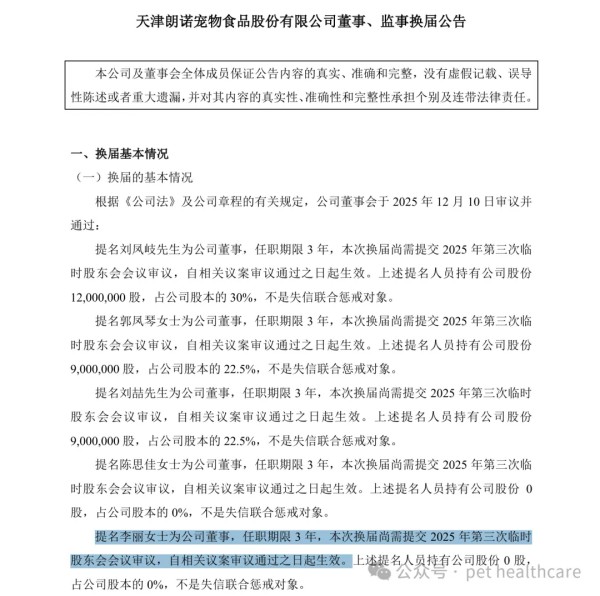 近日,天津朗诺宠物食品股份有限公司发布了董事、监事换届公告,提名李丽女士为公司董事,任职期限3年,本次换届尚需提交2025年第三次临时 股东会会议审议,自相关议案审议通过之日起生效。