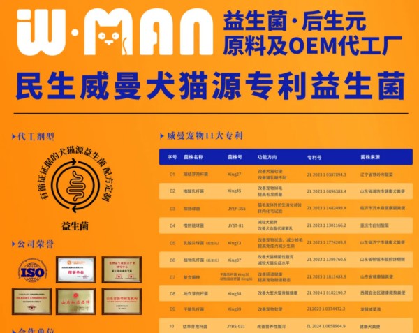 威曼宠物背靠母公司山东中科嘉亿,28项中国发明专利,11项宠物专利能够满足绝大多数客户要求。打造十万级洁净车间发酵生产线,提供品质卓越、价格实惠的各种益生菌及后生元、浓缩发酵液、动植物用益生菌原料及服务,拥有独立菌种资源库WMMCC,内存2100余株自有菌株,威曼宠物致力于研发更适合中国犬猫的益生菌,同时亦可提供客制化菌粉、产品OEM服务,全力满足客户生意需求,民生威曼(山东)动物健康科技有限公司致力于为宠物健康产品提供核心技术支持及有效的解决方案。