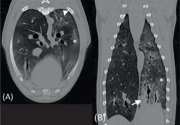 所有肺叶均显示明显的、中度的非结构性间质至肺泡肺模式,并伴有周边加重(图2)。观察到广泛的轻度支气管壁增厚,伴有多灶性支气管周围袖套征。总之,混合性肺模式及其周边加重最符合血管圆线虫感染引起的寄生虫性肺炎。可能性较小的鉴别诊断包括肺微出血、其他物种(例如狐环体线虫)引起的寄生虫性肺炎、细菌性或慢性支气管炎以及间质性肺炎。