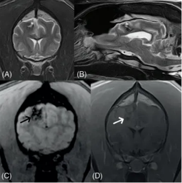 图1初次就诊时不同序列的脑部MRI图像:A, T2加权横断面和 B, 矢状面,C, 磁敏感加权序列和 D, 对比注射后T1加权序列(图片左侧为患者右侧)。在右侧顶叶,可见一个边界清晰、轴内、圆形至卵圆形、T2加权等信号和T1加权低信号的病变(星号),伴有薄层周边对比增强(白色箭头)。注意磁敏感加权序列中的低回声边缘,T2加权序列中围绕病变的黑边(黑色箭头),以及T2加权高信号的液-液线。病变周围白质存在边界不清的T2加权高信号,符合病灶周围水肿(箭头)。病变对大脑镰和侧脑室显示出中度的占位效应。T2 W, T2加权; T1 W, T1加权。