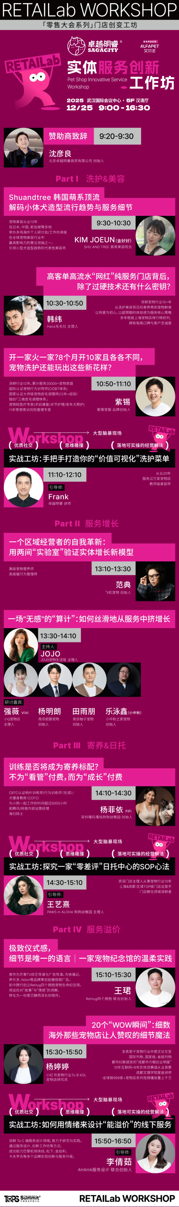 本论坛首创的"实战工作坊"环节,打破传统的单向聆听模式,开启真正的深度互动与智慧共创。为此,我们特别邀请到多位来自全国不同城市、在宠物服务细分领域已取得卓越成果的顶尖门店主理人,出任各小组的"明星组长"。他们不仅是成功的经营者,更是洞察需求、破解难题的实战家,你将不再是"听课",而是与优秀实践者的"并肩作战",相信在思想碰撞中,可以找到你想要的答案。