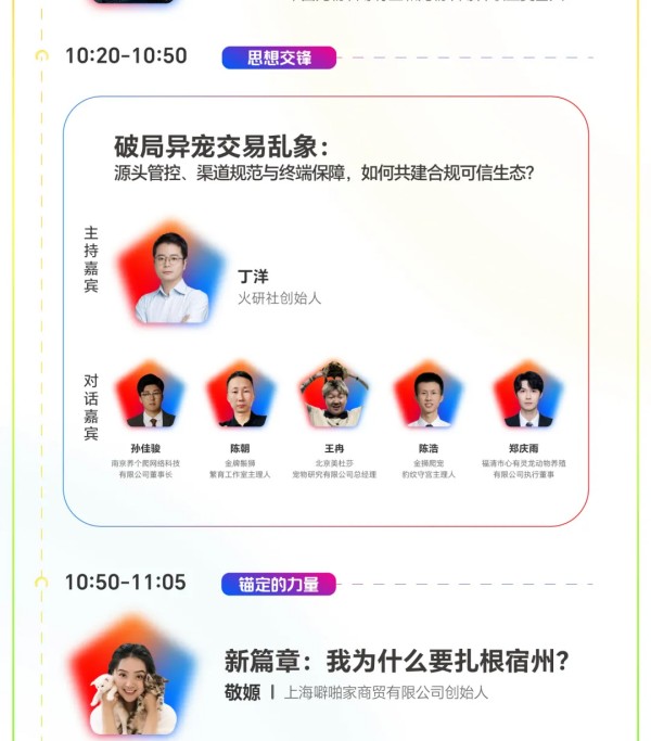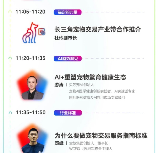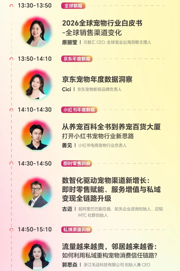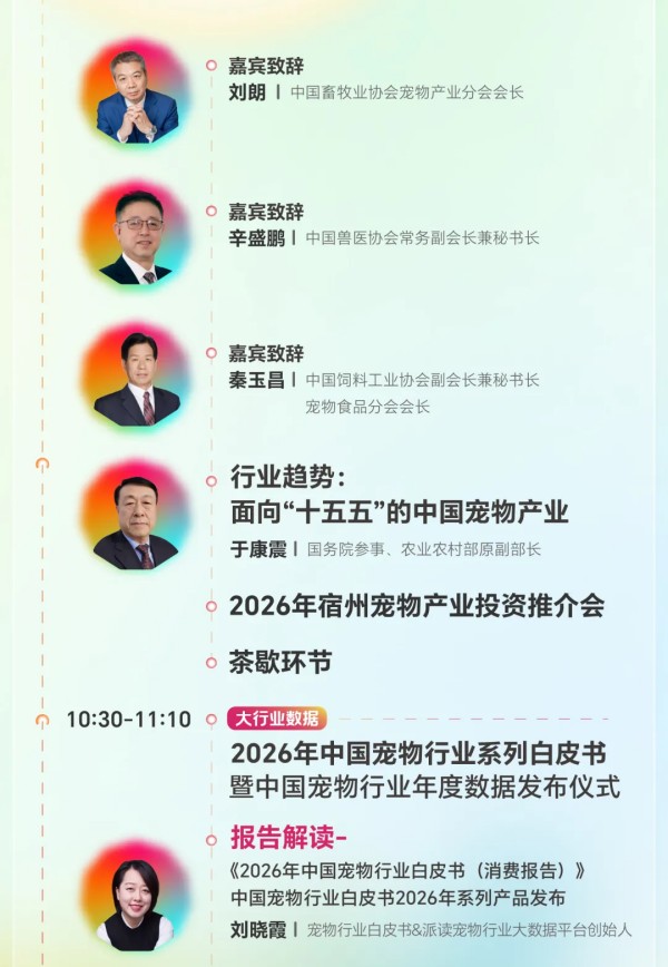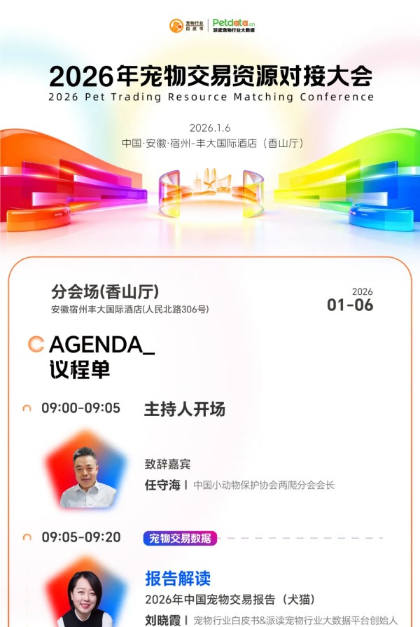参会指南详情 本次大会为期两天,1月5日将举办2026年中国宠物行业数据发布会,会上将重磅首发《2026年宠物行业白皮书(消费报告)》《2026全球宠物行业白皮书》《2026年中国宠物交易报告(犬猫)》,并联合淘天、京东、抖音、小红书首次实现宠物板块年度数据同台发布。1月6日将举办2026年宠物交易资源对接大会,会上四场深度圆桌对话,助您破解异宠交易与繁育痛点。不仅如此,将于大会期间正式面向宠物行业进行长三角宠物交易产业带合作推介(宿州资源)。同时,鞍山宠物交易资源推介(鞍山资源)也将同期举行目前。除此之外,本次大会还将举办PetAwards派读奖颁奖典礼。目前,大会全议程已公布,详情可查看下方议程图: 1月5日2026年中国宠物行业数据发布会 查看议程 1月6日2026年宠物交易资源对接大会 查看议程 本届大会以宿州为轴,以数据为线,串联起中国宠物行业的完整图景。 我们真诚欢迎您扫码报名,共赴本次数据大会。 名额有限,先到先得。