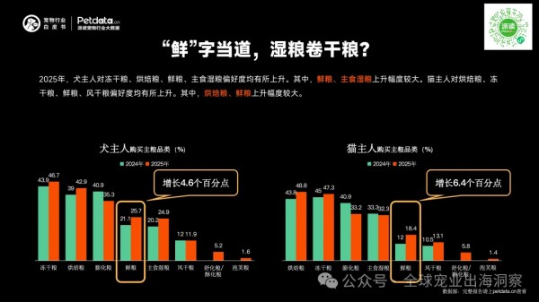 犬主人对冻干粮、烘焙粮、鲜粮、主食湿粮偏好度均有所上升。其中,鲜粮、主食湿粮上升幅度较大。
