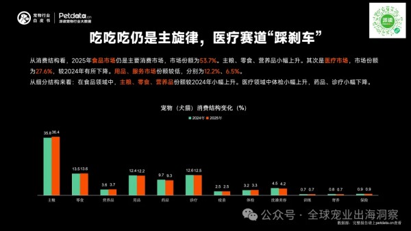 宠物医疗市场较2024年有所下滑,市场份额为27.6%。其中,药品、诊疗小幅下降。但这并非需求减少,而是消费理性的体现——宠主更倾向于“大病小病忙到院,驱虫免疫缓一缓”,诊疗活跃但预防支出更加审慎。