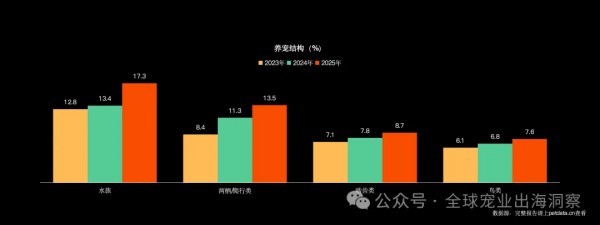 宠物数量增长已进入平台期,猫数量优势进一步扩大。2025年: