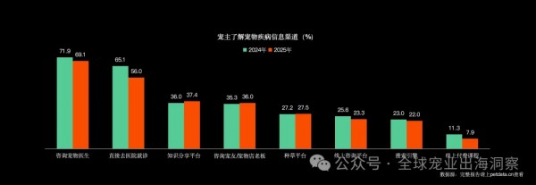 咨询宠友/宠物店老板、种草平台、线上咨询平、搜索引擎了解相关疾病信息,占比均在20%以上