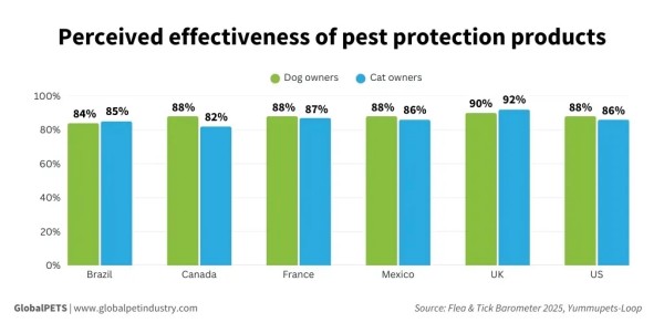 01 使用体验:给药难度并未成为主要问题 在使用层面,多数宠物主人并未将“给药难度”视为主要问题。调研显示,超过九成的狗主人认为驱虫产品容易使用,猫主人中持相同看法的比例也接近八成。 不同国家之间虽存在一定差异,但整体评价始终维持在较高区间。例如,加拿大有88%的猫主人认为给药过程顺畅,巴西和墨西哥分别为84%和83%,美国和法国也均超过80%,英国相对较低,但认可度仍达到77%。 ▲ 宠物主对驱虫产品有效性的认知对比: 绿色柱状图代表狗主人,蓝色柱状图代表猫主人。在英国,90%的狗主人和92%的猫主人认为驱虫产品有效;法国分别为88%和87%;墨西哥为88%和86%;美国为88%和86%。整体来看,各国宠物主对驱虫产品有效性的认可度普遍较高。 数据来源:Flea & Tick Barometer 2025, Yummypets–LOOP 相比之下,认为给宠物使用驱虫产品存在困难的受访者比例整体较低。狗主人中,美国和墨西哥仅有1%表示使用不便,法国为5%;猫主人中的比例略高,英国为11%,其后依次为法国(8%)、美国(6%)、墨西哥(5%),加拿大和巴西均为4%。 02 口服产品:适口性拉开市场差异 相比给药流程本身,口服驱虫产品在“是否愿意接受”这一点上更容易拉开差距。 在美国和墨西哥,均有54%的宠物主人表示宠物喜欢口服驱虫产品的味道,加拿大为51%,巴西也接近一半。相比之下,欧洲市场的反馈更为谨慎,英国有54%、法国有48%的宠物主人认为宠物并不喜欢相关产品的口味。 这种差异并未体现在产品是否被使用上,而更多反映在使用过程中的配合度和体验感受。 03 产品效果:信任度保持在高位 在效果层面,宠物主人的态度则更为集中。无论是狗主人还是猫主人,对驱虫产品有效性的认可度普遍保持在80%以上。 英国的信任度相对更高,狗主人中有90%、猫主人中有92%认为产品有效;其他国家的认可比例也多集中在84%–88%区间。认为产品效果不佳的反馈始终处于低位,各国大多在2%–7%之间。