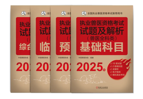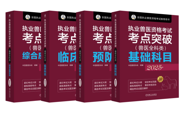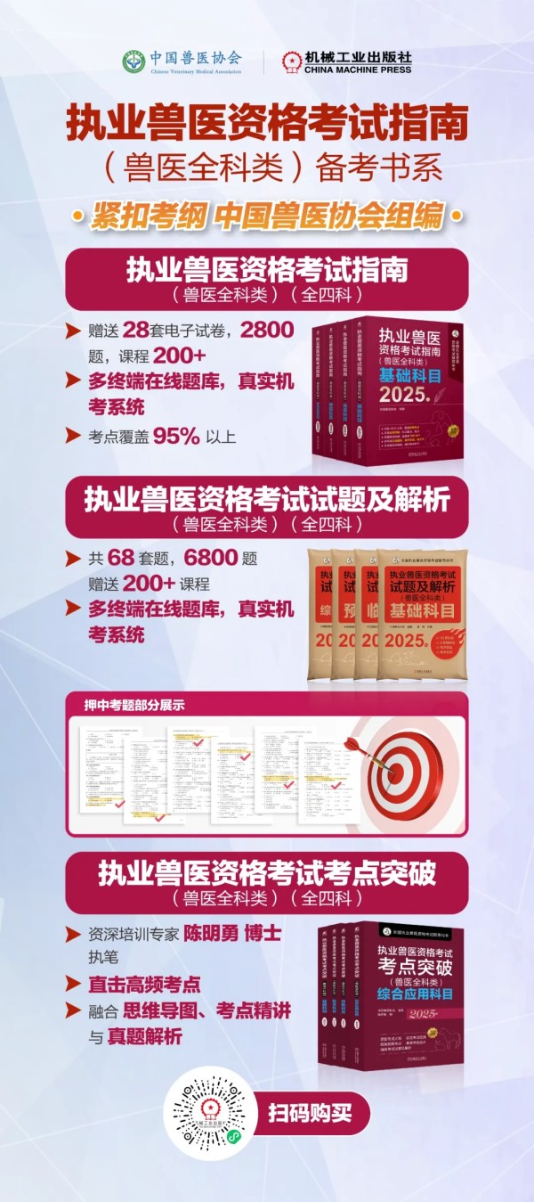 由中国兽医协会联合机械工业出版社出版的执业兽医资格考试系列图书严格围绕《2025年全国执业兽医资格考试大纲(兽医全科类)》要求的知识点,汇聚各学科专家精心编写而成。