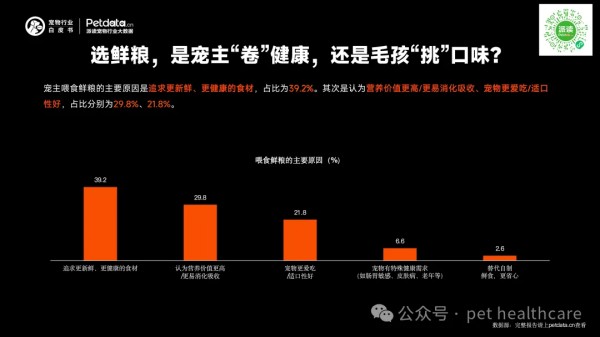 宠主喂食鲜粮的主要原因是追求更新鲜、更健康的食材,占比为39.2%。其次是认为营养价值更高/更易消化吸收、宠物更爱吃/适口性好,占比分别为29.8%、21.8%。