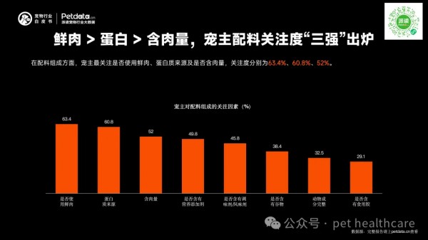 在配料组成方面,宠主最关注是否使用鲜肉、蛋白质来源及是否含肉量,关注度分别为63.4%、60.8%、52%。
