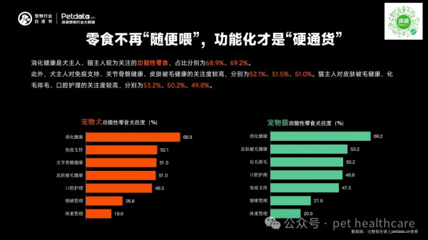 消化健康是犬主人、猫主人较为关注的功能性零食,占比分别为68.9%、69.2%。此外,犬主人对免疫支持、关节骨骼健康、皮肤被毛健康的关注度较高,分别为52.1%、51.5%、51.0%。猫主人对皮肤被毛健康、化毛排毛、口腔护理的关注度较高,分别为53.2%、50.2%、49.8%。