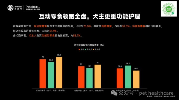 在购买零食方面,互动型零食是宠主主要购买的品类,占比为75.0%。其次是传统零食,占比为57.0%。功能型零食相对占比较低,但仍有较高的增长空间,占比为51.4%。分犬猫来看,犬主人购买功能型零食的占比较高,为58.7%。
