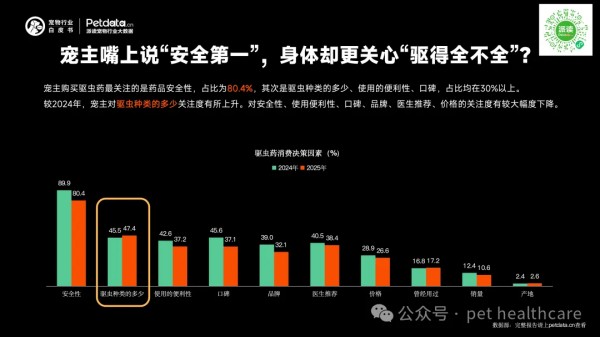 宠主购买驱虫药最关注的是药品安全性,占比为80.4%,其次是驱虫种类的多少、使用的便利性、口碑,占比均在30%以上。较2024年,宠主对驱虫种类的多少关注度有所上升。对安全性、使用便利性、口碑、品牌、医生推荐、价格的关注度有较大幅度下降。