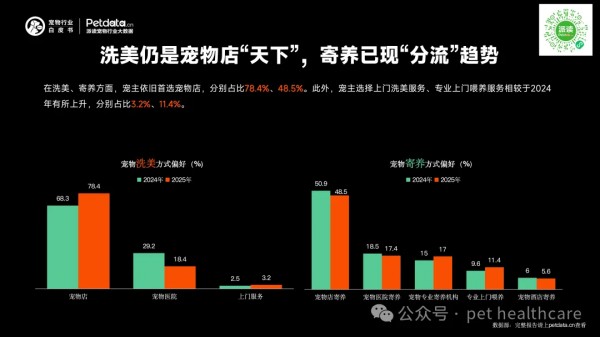 在洗美、寄养方面,宠主依旧首选宠物店,分别占比78.4%、48.5%。此外,宠主选择上门洗美服务、专业上门喂养服务相较于2024年有所上升,分别占比3.2%、11.4%。