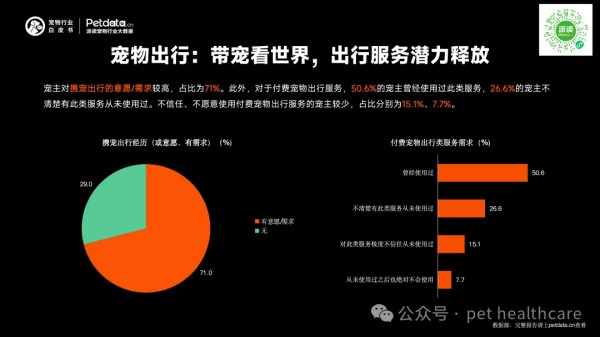 宠主对携宠出行的意愿/需求较高,占比为71%。此外,对于付费宠物出行服务,50.6%的宠主曾经使用过此类服务,26.6%的宠主不清楚有此类服务从未使用过。不信任、不愿意使用付费宠物出行服务的宠主较少,占比分别为15.1%、7.7%。