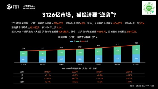 2025年城镇宠物(犬猫)消费市场规模达3126亿元,较2024年增长4.1%。其中,犬消费市场规模达1606亿元,较2024年上升3.2%,猫消费市场规模达1520亿元,较2024年上升5.2%。预计2028年城镇宠物(犬猫)消费市场规模达4050亿元。其中,犬消费市场规模达1923亿元,猫消费市场规模达2184亿元。
