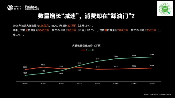 2025年城镇犬猫数量为1.26亿只,较2024年增长221万只(上升1.8%)。其中,宠物犬的数量为5343万只,较2024年增长85万只(小幅上升1.6%);宠物猫的数量为7289万只,较2024年增长136万只(上升1.9%)。