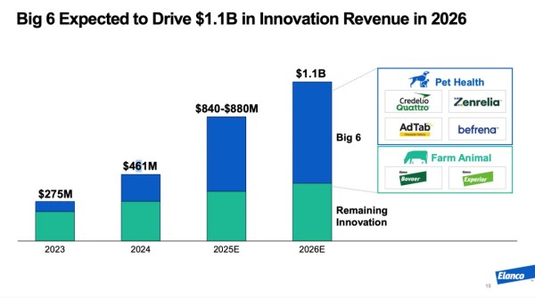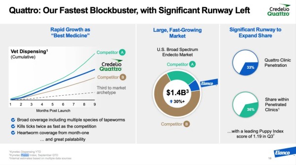 这些管线的布局逻辑体现了硕腾对伴侣动物医疗长期趋势的判断:从传统的传染病预防、寄生虫控制,转向慢性病管理和生活质量改善。慢性肾病、肿瘤、心脏病等疾病的治疗周期长、用药频次高,一旦形成有效的临床解决方案,将带来持续稳定的收入流。硕腾强调,这些创新大多来自公司内部的研发能力。公司拥有超过1600名研发人员,过去75年积累的专有研究数据覆盖90个治疗靶点,这种“从发现到交付”的全链条自主可控能力,是其创新引擎的核心竞争力。从2013年到2024年,硕腾在研发上的累计投入超过50亿美元。Elanco在JPM大会上展示的是一个转型者的故事。CEO Jeff Simmons用一组数据勾勒出公司从2022年的负增长到2025年预期6-6.5%增长的修复轨迹:2022年有机固定汇率收入增长率为-3%,2023年为1%,2024年为3%,2025年预期达到6-6.5%。与收入增长同步的,是创新产品收入的快速爬坡——从2021年的7200万美元增长至2024年的4.61亿美元,2025年预期达到8.4-8.8亿美元,2026年预期突破11亿美元。这个转型故事的核心,是“Big 6”产品组合的成功商业化。Credelio Quattro:在9个月内快速完成市场渗透。礼蓝将Credelio Quattro(犬用四联驱虫药)称为公司“最快的重磅产品”,这款2024年上市的产品在短短9个月内就展现出了重磅产品的潜力。公司披露的数据显示,Quattro已进入美国33%的兽医诊所,在已渗透诊所中的份额达到36%。更值得关注的是幼犬指数(Puppy Index)——这个指标反映了新养犬家庭对产品的接受度,Quattro在2024年第三季度的幼犬指数达到1.19,领先竞品。Quattro的产品优势体现在四个维度。一是覆盖范围:包括多种绦虫在内的寄生虫谱。二是起效速度:杀蜱速度较竞品快2倍。三是心丝虫保护:从首月开始即提供覆盖。四是适口性:现场演示显示宠物对药物的接受度良好。礼蓝特别强调了Quattro所处市场的增长潜力。美国broad-spectrum endecto(广谱内外寄生虫)市场规模超过14亿美元,年增长率超过30%。作为“第三入场者”,Quattro采用了典型的挑战者策略——通过更全面的覆盖和更优的临床表现,在已有竞品建立的市场中抢夺份额。Zenrelia:国际市场的超预期表现。Zenrelia(犬用JAK抑制剂)在美国市场的表现稳健,2024年第三季度销售额较第二季度翻倍,患者份额达到5%。9月份的标签更新(删除了疫苗诱导疾病的表述)后,新增了1900个购买者,显示市场对产品安全性顾虑的缓解正在转化为实际销售。但真正让礼蓝管理层兴奋的是Zenrelia的国际市场表现。在巴西、加拿大、日本等市场,Zenrelia实现了双位数的市场份额增长,通常需要3-4年才能达到的份额水平在第一年就已完成。在欧洲、英国、澳大利亚等市场,早期销售势头强劲。礼蓝在1.5年内完成了8个国家的监管批准,覆盖了所有主要的宠物医疗市场。公司估算,Zenrelia的国际市场总规模超过7亿美元,年增长率为双位数。这个数据背后的逻辑是全球化趋势的扩散——随着新兴市场宠物拥有量增加、人宠情感深化,对高端皮肤病治疗的需求正在快速释放。Befrena:下一个预期重磅的便利性革命。Befrena(犬用长效止痒药)在2025年第四季度获得FDA批准,预计将在2026年上半年正式上市。礼蓝对这款产品寄予厚望,称其为“下一个预期重磅产品”。产品的差异化体现在三个方面。一是起效速度:1天内开始缓解瘙痒。二是持续时间:单次给药维持至少6周。三是适应症定位:特别适合季节性过敏病例。礼蓝委托的市场调研显示,83%的美国兽医表示“很可能使用”Befrena,尤其是在季节性病例中。在硕腾主导的13亿美元美国犬类皮肤病市场中,Befrena的战略意义在于提供一个“便利性+有效性”兼具的新选择。对于那些不愿每日给药(Apoquel)或不便频繁带宠物去诊所注射(Cytopoint)的宠物主,6周长效口服药填补了一个明确的临床空白。AdTab、Bovaer、Experior:完整产品组合的战略拼图。AdTab是一款犬用咀嚼片,虽然公司未在JPM大会上详细披露,但其定位是补充宠物健康产品组合,增强在兽医诊所和零售渠道的货架完整度。Bovaer(牛用,反刍动物甲烷减排)和Experior(牛用饲料添加剂)虽然属于畜禽板块,但其战略意义在于帮助礼蓝建立"可持续性"的品牌标签。Experior是首个获得美国FDA环境声明批准的产品,能够减少氨气排放,这种“经济价值+环境价值”的双重定位,帮助畜牧企业达成ESG目标。Experior的市场表现强劲。客户留存率超过90%,在美国牛群规模处于历史低位的背景下,强劲的生产者经济效益推动了产品渗透。美国和加拿大市场的总规模为3.5亿美元,2025年第一季度的全球销售额同比增长3倍。下一波创新:5-6个潜在重磅(2026-2031)。礼蓝在JPM大会上披露,公司的研发管线中有超过15个项目分布在8大创新领域,预计在2026-2031年间将有5-6个潜在重磅产品获批,峰值销售潜力超过20亿美元(未调整技术成功风险)。