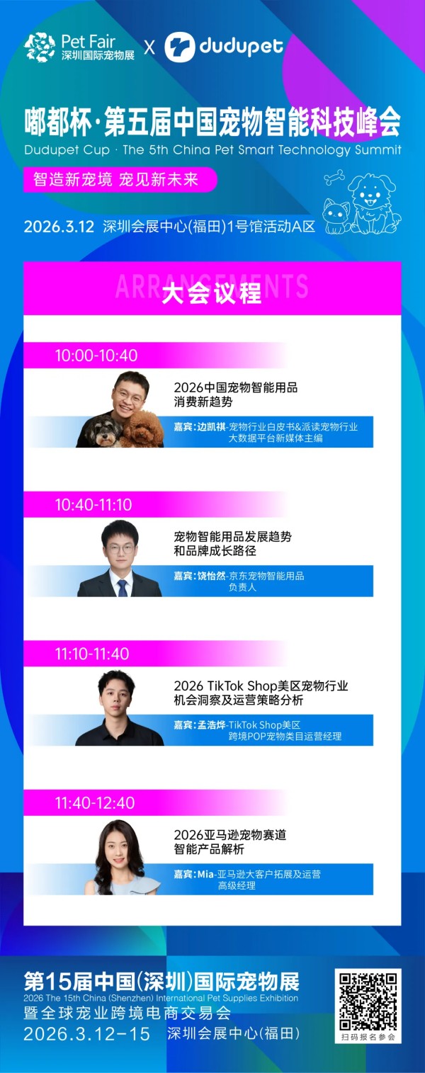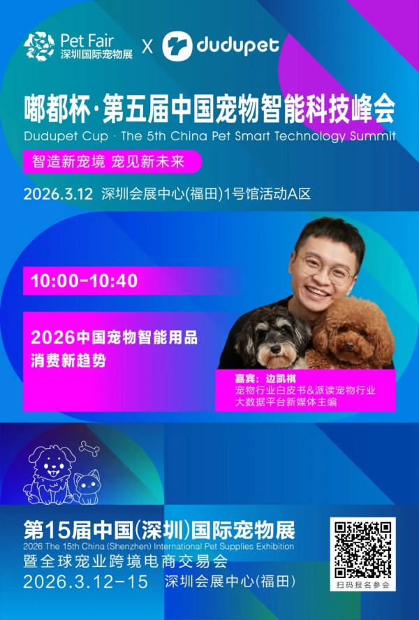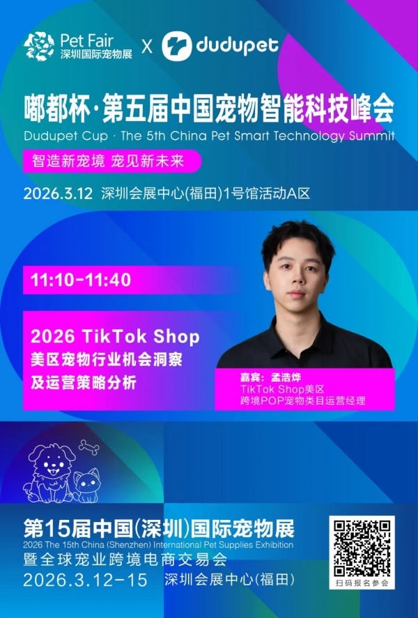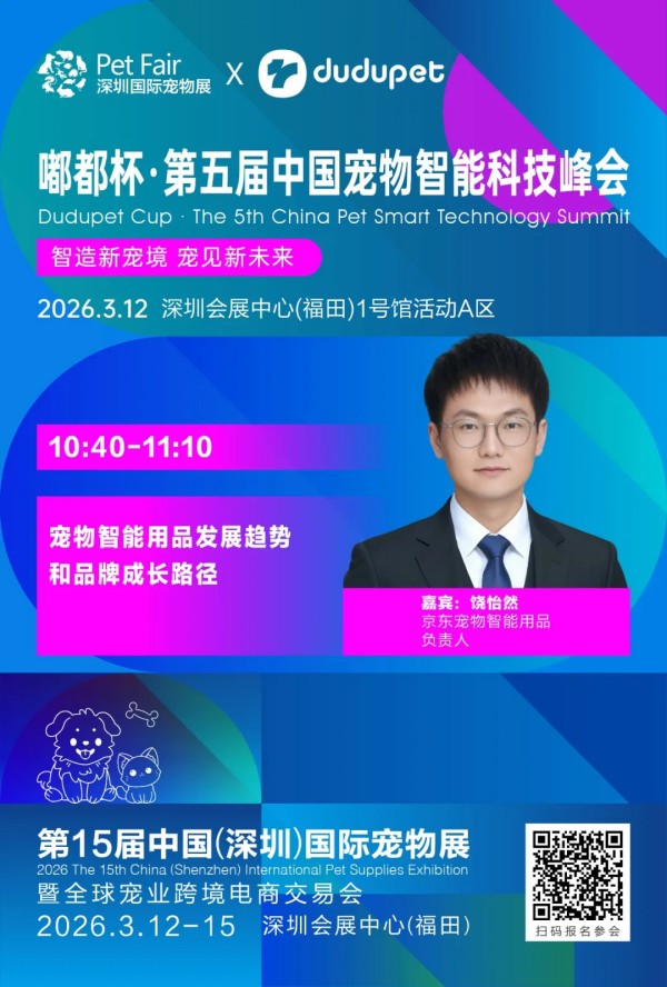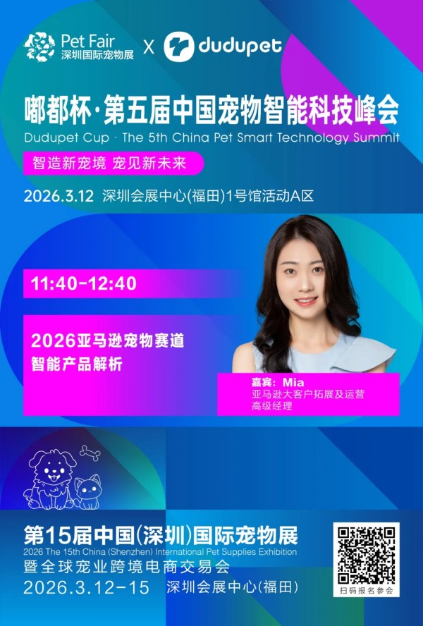 嘟都宠物是一家专注于智能宠物用品研发、生产与销售的高科技企业,以“慧爱未来,共生共荣”为核心理念,构建了覆盖智能喂养、健康监测、人宠互动等多场景的产品矩阵。公司自主研发的智能喂食器、AI宠物管家、智能猫砂盆等八大系列产品,通过AIoT技术实现精准投喂、行为分析、远程互动等创新功能,以高性价比优势满足全球养宠家庭的多元化需求。 大会嘉宾将聚焦系列议题进行解读,包括:2026中国宠物智能用品消费新趋势、宠物智能用品发展趋势和品牌成长路径、2026 TikTok Shop美区宠物行业机会洞察及运营策略分析、2026亚马逊宠物赛道智能产品解析等热点内容,揭示宠物主需求的演变方向,为智能产品创新提供市场依据,助力中国企业突破国内市场的局限,在新的竞争环境中找到差异化成长路径。 边凯祺 宠物行业白皮书&派读宠物行业 大数据平台新媒体主编 饶怡然 京东宠物智能用品负责人 孟浩烨 TikTok Shop美区跨境POP宠物类目运营经理 Mia 亚马逊大客户拓展及运营高级经理 本场峰会不是一场单向的知识灌输,而是一次双向的思维碰撞。它面向所有正在思考和实践宠物智能科技创新的行业同仁——无论是产品研发者、品牌经营者,还是渠道开拓者。 如果你在思考,如何让智能产品在功能内卷时代不可替代; 如果你在探索,如何让自有技术承载你的品牌主张; 如果你在尝试,将跨境流量转化为全球化品牌的起点; 如果你坚信,生态才是价值创新的源泉与品牌信任的基石…… 那么,2026年3月12日,深圳会展中心(福田),让我们与京东、TikTok、亚马逊及派读宠物一起,把握宠物智能科技行业新风口,共探真正能够融入生活、创造持续价值的智能产品和生态系统,赢得用户的长久青睐。 参会对象:宠业品牌商、生产制造商、宠业经销商、零售门店、电商等。 参会咨询:0755-82223656 长按识别或扫描二维码 免费报名参会