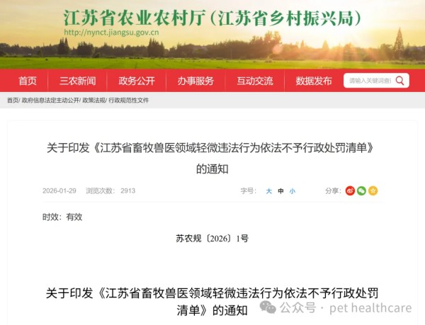 近日,江苏省农业农村厅正式印发《江苏省畜牧兽医领域轻微违法行为依法不予行政处罚清单》(以下简称《不予处罚清单》),同步发布相关实施通知,明确多项与宠物医疗行业密切相关的轻微违法行为,在满足特定条件下可依法不予行政处罚。该政策自2026年3月1日起实施,有效期至2031年2月28日,将为全省宠物诊疗机构、执业兽医纾困减负,推动行业规范健康发展。