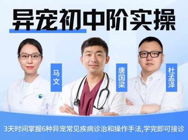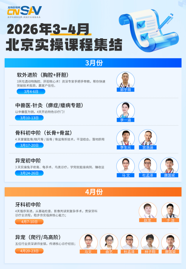 ◉授课内容概要: ·DAY1-开胸术、肺叶摘除术及PDA模拟手术 ·DAY2-乳糜胸诊治及胸导管放置术 ·DAY3-肝脏胆道手术及胆管支架放置术 适合人群:具备一定外科基础,渴望在软组织外科方向上精进的医生 (点击海报查看具体详情) ◉授课内容概要: ·DAY1-针灸基础及头颈部针灸操作 ·DAY2-瘫痪病例的中兽医治疗方案 ·DAY3-灸法与前肢常用穴位 ·DAY4-中药基础与后肢常用穴位 适合人群:0基础、渴望开展中兽医的医生 (点击海报查看具体详情) ◉授课内容概要: ·DAY1-骨科基础 ·DAY2-前肢骨骨折处理 ·DAY3-后肢骨骨折处理 ·DAY4-骨盆骨折处理及股骨头切除 适合人群:具备一定外科基础,具备一定外科基础,渴望开展骨科的医生 (点击海报查看具体详情) ◉授课内容概要: ·DAY1-食草小型哺乳动物常见病诊治及手术方法 ·DAY2-爬宠基础操作及常见病诊治 ·DAY3-鸟类基础操作及常见疾病诊治 适合人群:0基础,渴望快速开展异宠诊疗的全科医生 (点击海报查看具体详情) ◉授课内容概要: ·DAY1-牙科检查、牙片拍摄及口腔阻滞操作 ·DAY2-牙周病诊治及拔牙基础操作 ·DAY3-猫牙吸收、猫口炎的诊治及全口拔牙技术 ·DAY4-口腔软组织手术操作 适合人群:具备一定外科基础,渴望开展牙科及口腔软组织外科手术的医生 (点击海报查看具体详情) ◉授课内容概要: ·DAY1-爬行动物麻醉及血液学检查 ·DAY2-爬行动物、鸟类影像学检查及龟复杂疾病诊治 ·DAY3-蜥蜴、蛇的复杂疾病诊治及手术操作 ·DAY4-鸟类疾病诊治和手术操作 适合人群:对爬行动物、鸟类有一定基础,渴望进阶提升的异宠医生 (点击海报查看具体详情) -报名方式- 添加课程顾问 - 限时实操优惠 - 后续实操课程通知 名师带教课程贴近临床 权威师资:行业资深专家授课,临床经验倾囊相授。 前沿知识:紧跟宠物医学前沿动态,掌握最新诊疗技术。 模拟真实病例场景,现场操作指导,即学即用。 专业实操基地 理论、实操双教室,为参课学员提供早午餐及住宿,设备与物料充足,专业设备(如手术床、无影灯、高清视频投影等)舒适专业教学环境,帮助学员快速掌握专业技能。 *住宿可拼团拼房服务