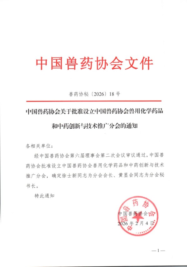 协会动态|中国兽药协会关于批准设立中国兽药协会兽用化学药品和中药创新与技术推广分会的通知
