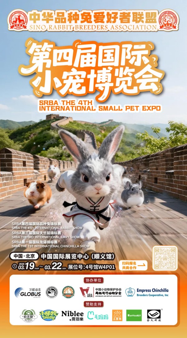 中华品种兔爱好者联盟(SRBA)携手国际权威评审体系,定档2026年3月19日-22日雄鹰京宠展期间,盛大启幕2026年度开篇盛典—— 第四届SRBA国际小宠博览会 。届时,第四届国际品种兔锦标赛、第三届国际天竺鼠锦标赛以及首届国际龙猫锦标赛三大国际权威小宠赛事将首度齐聚首都北京,三轨并行,同台绽放,共启中国小宠赛事国际化新篇章。