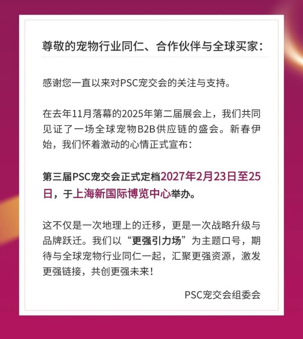 上海新国际博览中心作为全球领先的会展综合体,将以超大型、高标准的展示空间,更好地承载PSC宠交会未来发展的规模与愿景。