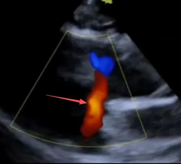 (视频内可见穿过室间隔出现红色血流,如图箭头所指,为靠近探头的方向,是左向右分流)