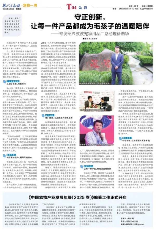 二十余载深耕: 从初心出发,向新而行 2015年,徐燕华接过父亲的班,成为这家企业的第二代掌舵人。摆在他面前的,是一家稳健运行了多年的老厂,也是一份沉甸甸的传承。 企业创立之初,定下的理念很简单,也很朴素——“关爱宠物每一天”。这一理念贯穿工厂发展始终,也成为徐燕华经营管理的底层逻辑。在他的带领下,波波始终坚守实业初心,专注于为全球宠物提供安全、舒适、耐用的日常用品。目前,企业已形成覆盖宠物洗护香波、牵引胸背带、宠物玩具、猫抓板、食具窝垫、宠物服饰等全品类产品体系,拥有上百项专利与数十项国内外商标,先后通过ISO9001质量管理体系、BSCI等多项权威认证,是业内兼具口碑与实力的优质制造商。 “宠物不会说话,它们的感受最真实。产品安不安全、舒不舒服,它们会用行动告诉我们。”徐燕华说,正是这份对生命的敬畏与温柔,让波波在激烈的市场竞争中,始终守住品质底线,走出一条长期主义之路。 品质为基:细节里的坚守,看得见的放心 在波波,品质从来不是一句口号,而是落实在每一道工序、每一个细节里的行动准则。徐燕华始终坚持,做宠物用品,就是做良心、做信任。从原料入库的第一关开始,企业就建立了严格的筛选与检测机制,所有面料、塑料、洗护原料等,都必须符合国内外安全标准,从源头杜绝隐患。 生产过程中,小到一根缝线的密度、一个卡扣的咬合力度,大到洗护产品的pH值、玩具的抗撕拉强度,都有明确的执行标准。徐燕华给我们讲过一个真实的细节:有一批出口海外的牵引带,在成品抽检时,工作人员发现少数产品的缝线边缘处理不够平整,虽然完全不影响使用,也未达到不合格标准,但团队依然决定整批返工复检。有人觉得过于严苛,可在波波的标准里,“差不多”就是差很多。 正是这种近乎“较真”的态度,让波波在海外市场站稳了脚跟。海外客户对产品的环保性、安全性、耐用性要求极高,尤其是欧美市场,检测标准细致、审核流程严格。曾经一款宠物玩具为了满足海外市场对涂层安全和咬扯强度的要求,团队前后打样十余次,反复测试、调整、优化,耗时近三个月才最终定型。这款产品上市后,凭借稳定品质长期返单,成为经典畅销款之一。 在徐燕华看来,高品质并不等于高成本,而是把钱花在刀刃上:用好料、做细工、控严管,减少售后与返工,反而能提升效率、赢得长期信任。多年来,波波积累了一大批合作十年以上的稳定海外客户,靠的不是低价,而是稳定如一的品质和靠谱的交付能力。 守正创新:老厂焕新,以品牌之力扬帆出海 如果说品质是波波的根基,那么创新就是企业持续向前的动力。在徐燕华的推动下,波波在传承稳健经营理念的同时,不断注入新的活力,实现“守正不移,创新不止”。 他非常重视产品研发与市场洞察,坚持紧跟全球养宠趋势,从宠物行为、使用场景、主人需求出发,优化产品设计。针对不同体形、不同品种的宠物,波波推出了细分款牵引带与胸背带,兼顾舒适与安全;根据宠物敏感肌肤特点,升级洗护配方,做到温和清洁、不伤皮毛;在玩具与猫抓板设计上,更注重趣味性与实用性结合,延长使用寿命,提升宠物使用体验。每年,波波都有多款新品上市,以持续创新满足市场多元化需求。 管理上,徐燕华推动流程优化与效率提升,引入更规范、透明的运营机制,让传统工厂向现代化、精细化管理转型。市场方面,他坚持以海外为主赛道,同时积极优化渠道结构,分散市场风险,面对原材料价格波动、国际贸易环境变化等外部挑战,始终保持稳健经营。 在他的布局下,波波不再只是“制造工厂”,而是向着品牌化、专业化、国际化稳步迈进。从产品出海到品牌出海,从代工配套到自主品牌立足海外,波波一步步完成蜕变,让“BOBO”成为海外养宠人群认可的中国宠物用品品牌。 以爱为伴:让每一件产品,都成为温暖陪伴 在波波工厂里,很多员工本身就是养宠人,对小动物有着天然的喜爱。徐燕华常说:“我们做的不只是产品,更是陪伴。”一根牵引带,连着主人与宠物的日常出行;一瓶沐浴露,关乎宠物的肌肤健康;一个玩具,填满它们独处的时光。每一件看似普通的用品,背后都是主人的牵挂和宠物的依赖。 这种“以爱为伴”的理念,也体现在企业的责任与担当上。波波坚持选用更环保、更安全的材料,减少对环境的负担,也为宠物营造更健康的使用环境;在生产中严控品质,杜绝安全隐患,让每一个使用波波产品的毛孩子都能被温柔对待。 多年来,企业始终坚持诚信经营、稳健发展,先后获得AAA级守合同重信用单位、浙江省著名商标、浙江名牌产品等多项荣誉。对徐燕华而言,这些认可不是终点,而是持续做好产品的动力。他始终保持低调务实的风格,不追求盲目扩张,不贪图短期利益,一心把产品做稳、做精、做长久。 面向未来:行稳致远,让温暖走向更多家庭 谈及未来,徐燕华的目标清晰而坚定:继续坚守品质初心,持续深化创新能力,深耕海外主流市场,不断提升品牌影响力,让波波的产品走进全球更多养宠家庭。 他表示,未来企业将继续加大研发投入,在安全、环保、智能、舒适等方向持续升级,推出更多贴合养宠趋势的优质产品;同时进一步优化供应链与生产效率,提升企业核心竞争力,在全球化的浪潮中,走出属于中国实业的稳健之路。 从1999年创立至今,绍兴波波宠物用品厂在二十余年的发展中,