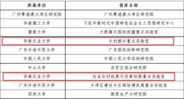 此次评审围绕智库建设基础、决策咨询贡献、社会影响力等维度综合评定,是省社科联落实新型智库建设决策部署、推进“强基攀登计划”的重要举措。华南农业大学乡村振兴重点实验室紧扣乡村振兴、粮食安全等国家重大战略,深度对接广东“百千万工程”,聚焦乡村产业、人才、文化、生态、组织振兴核心领域,搭建跨学科、复合型研究团队,主攻乡村产业提质、农业经济政策、城乡融合发展等方向,是服务基层治理、助力乡村全面振兴的专业化决策智库。实验室汇聚高层次专家人才,近三年产出大批高质量咨政成果,多项建议获省部级及以上采纳批示,为广东“百千万工程”落地实施提供精准智力支撑。华南农业大学农业农村政策与改革创新重点实验室依托学校国家重点学科和高端科研平台打造,聚焦农业农村制度改革、政策创新、未来农业发展等关键议题,深耕土地制度、经营体系、县域经济、绿色农业等研究领域,推动多学科交叉融合,以政策研究、理论创新破解农业农村发展难题,助力培育农业新质生产力、推进农业农村现代化,多项研究成果纳入国家和地方政策文件,为农业改革发展提供科学路径。