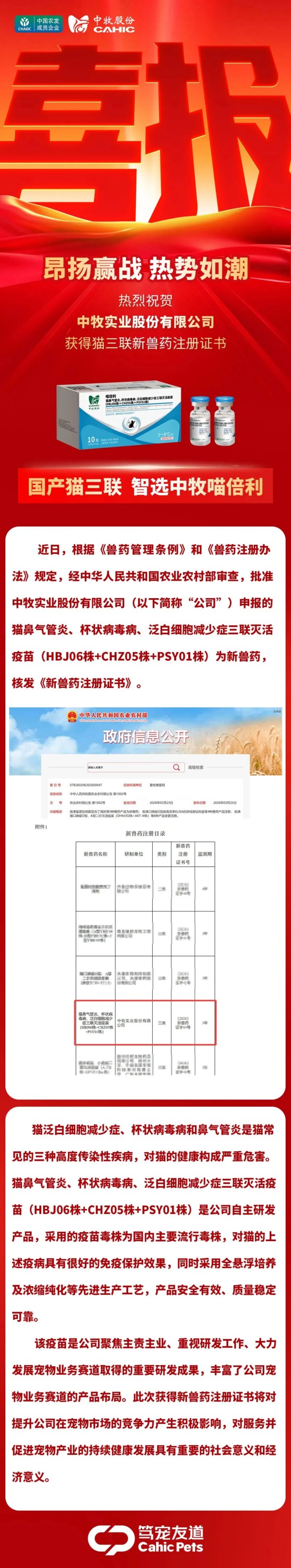 宠业科创投论坛战略合作成员企业中牧实业股份有限公司传来重大喜讯!由公司自主研制的猫鼻气管炎、杯状病毒病、泛白细胞减少症三联灭活疫苗(HBJ06株+CHZ05株+PSY01株),经中华人民共和国农业农村部严格审查,成功获批为新兽药,并获发《新兽药注册证书》,为国产宠物疫苗领域再添硬核力量!