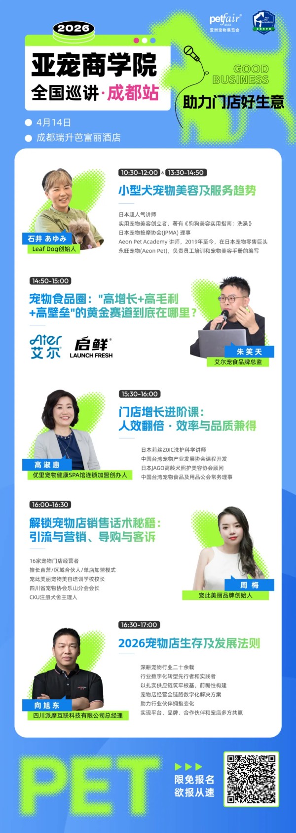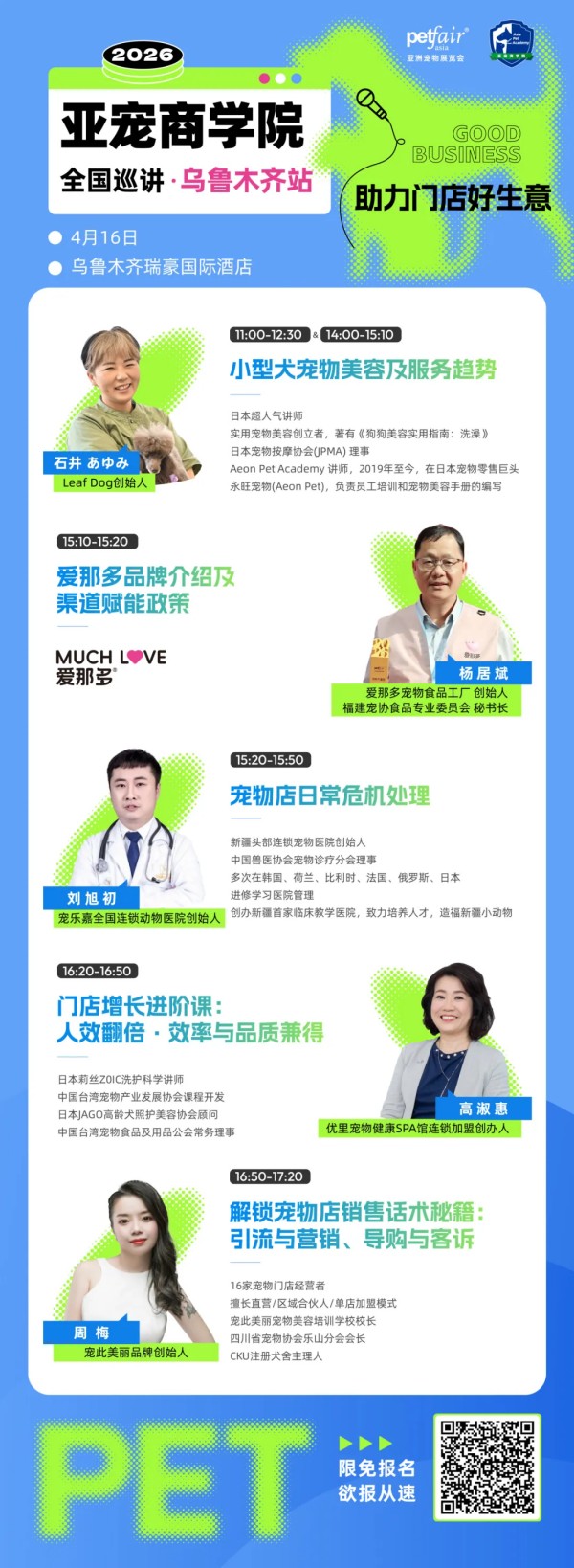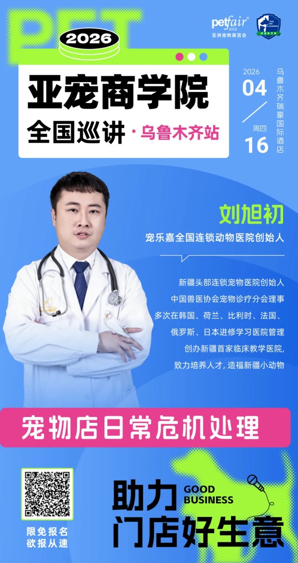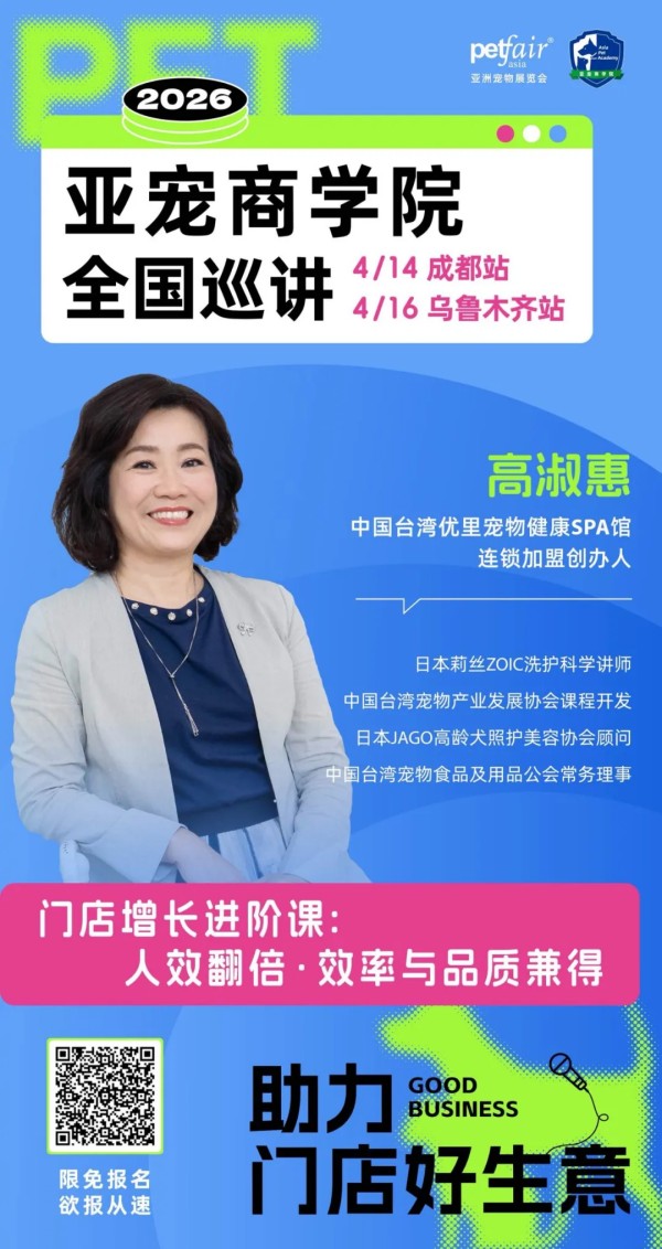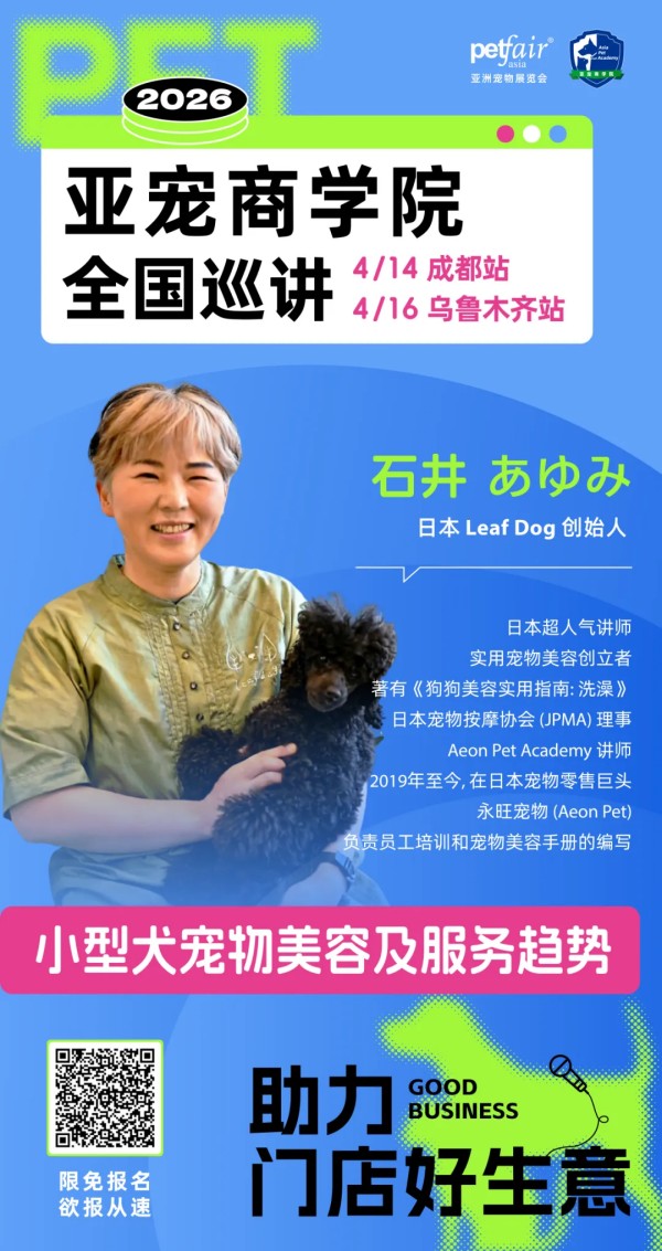 4月,日本超人气讲师、Leaf Dog创始人石井老师、中国台湾优里宠物健康SPA馆连锁加盟创办人高淑惠老师、宠此美丽品牌创始人周梅老师、四川派摩互联科技有限公司总经理向旭东总、宠乐嘉全国连锁动物医院创始人刘旭初老师将出席2026亚宠商学院【成都站】【乌鲁木齐站】等站。