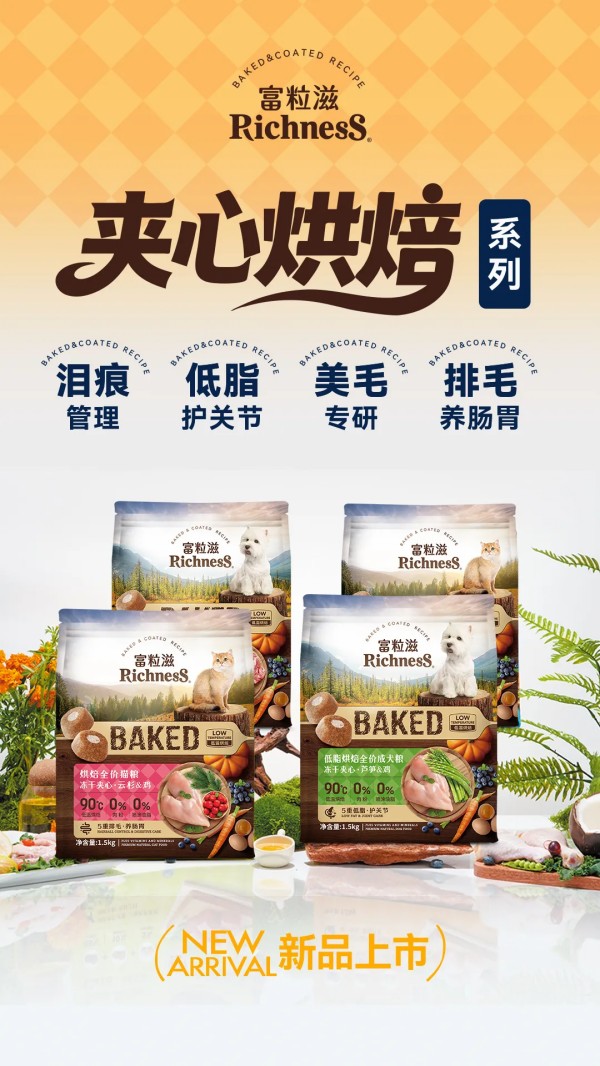 采用烘焙甜甜圈工艺,轻松征服挑嘴爱宠。犬粮甄选五重进口原料管控泪痕,焕净爱犬颜值;五重低脂护关节配方,科学养护关节,减轻肢体负担;猫粮精选五重进口美毛成分,滋养毛发、亮泽被毛;五重排毛养肠胃配方,温和护肠胃、助力顺畅排毛,呵护猫咪消化健康。
