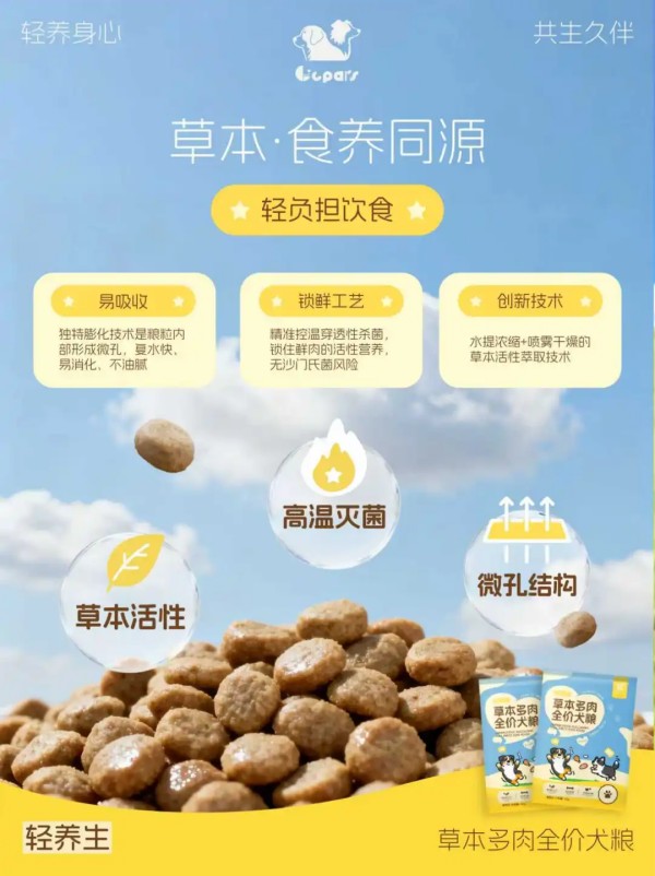 L·C Pals莱可以“轻养身心,共生久伴”为核心理念,跳出行业“高蛋白内卷”,回归科学配比,推出草本多肉全价犬粮,依托奥地利双螺杆膨化与肉浆灌注工艺,打造酥脆多孔、肉香自然的颗粒,易消化、好吸收,经权威检测,科学蛋白与黄金钙磷比精准满足日常所需而不添身体负担,更以东方“食养同源”智慧融萃草本精华,温和养护肠胃与关节,从根源守护爱犬活力状态——莱可,让陪伴更长久,让健康更轻盈,定义“轻养”新标准,回归科学喂养的初心。