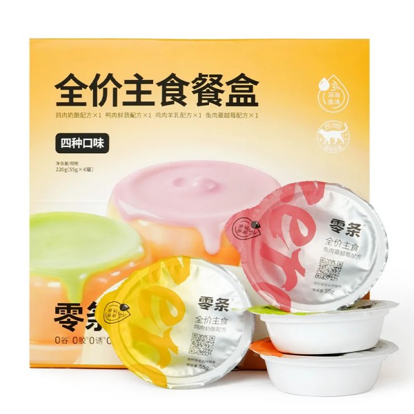 零条全价主食餐盒新包装升级,方便展示陈列,颜值与口感双在线,一盒四罐,四种口味不重样,顿顿有新鲜感,鸡肉羊乳好吸收,鸭肉鲜蔬清火缓泪痕,兔肉蔓越莓护泌尿,鸽肉奶酪营养滋补,营养均衡,健康配方,优质肉源喂食更安心,添加3%的深海鱼油,美毛亮毛;开罐即食,便捷喂养,一餐一罐新鲜不浪费,赶紧给毛孩子试试吧!