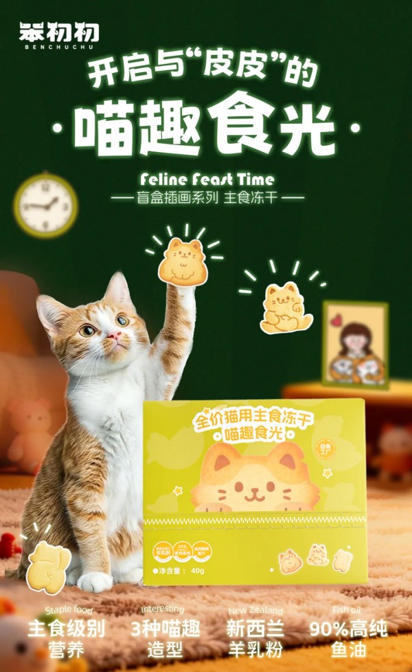 颜值优势:以笨初初IP“皮皮”为灵感,主食冻干有三种造型,分别为招财猫、乖乖猫、屁屁猫。