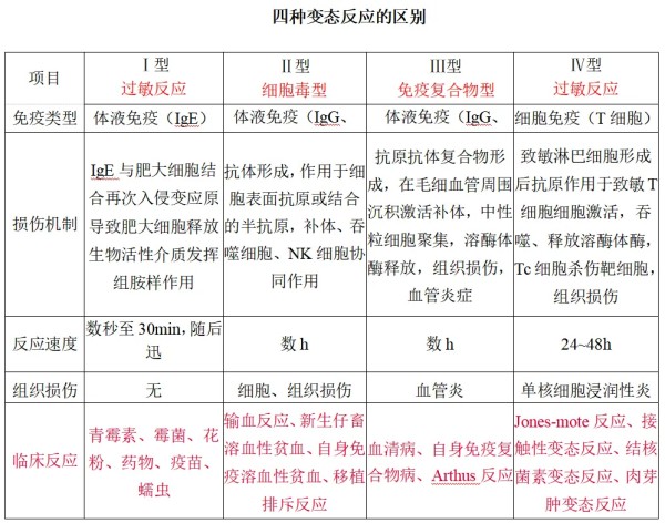 1. 根据变态反应发生机制及临床特点,将变态反应分为四种类型:Ⅰ型为过敏反应型、IgE型或反应素型;Ⅱ型称为细胞溶解型或细胞毒型;Ⅲ型为免疫复合物型或血管炎型;Ⅳ型为迟发型变态反应或T细胞介导型。