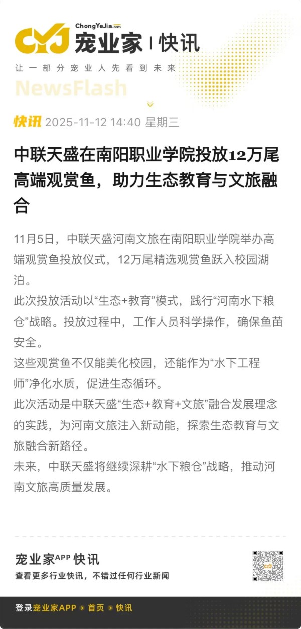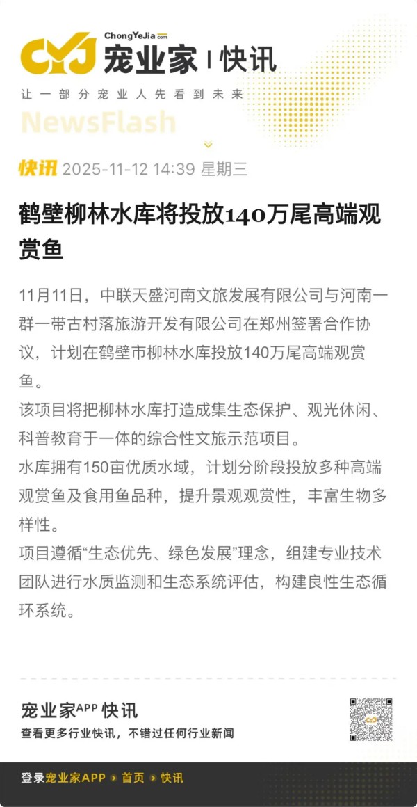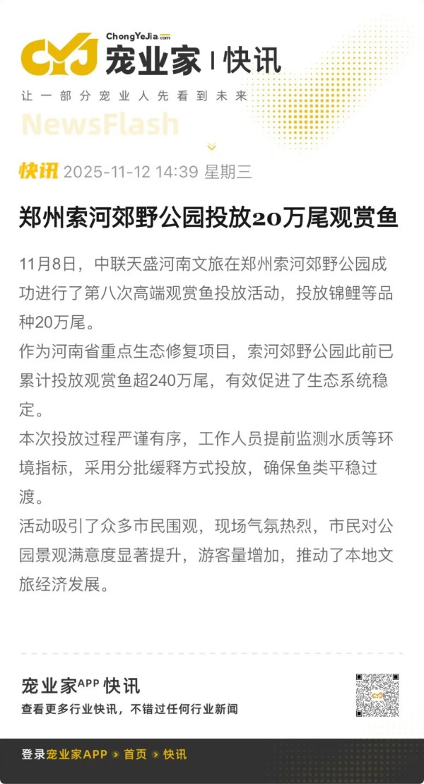 郑州索河郊野公园投放20万尾观赏鱼;鹤壁柳林水库将投放140万尾高端观赏鱼